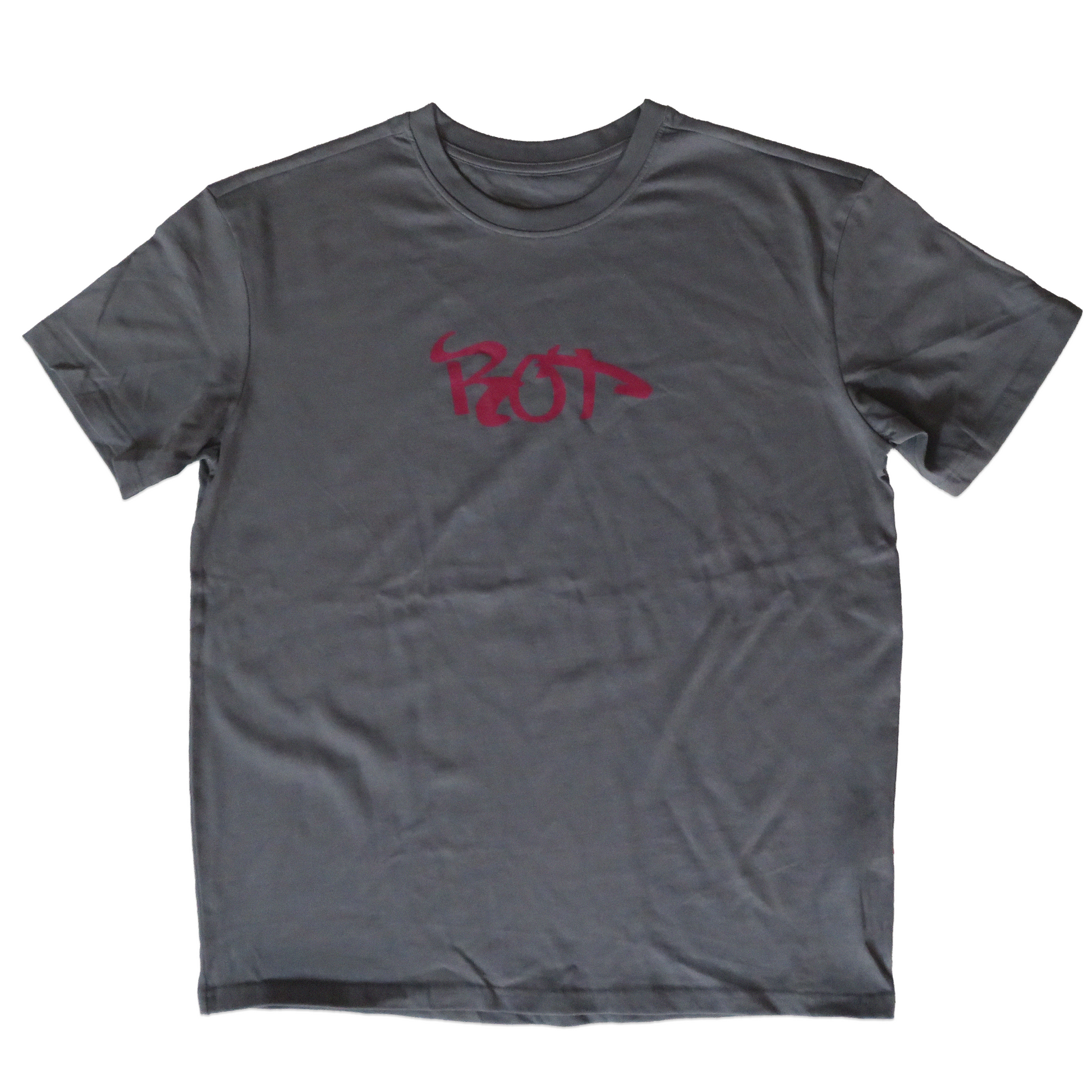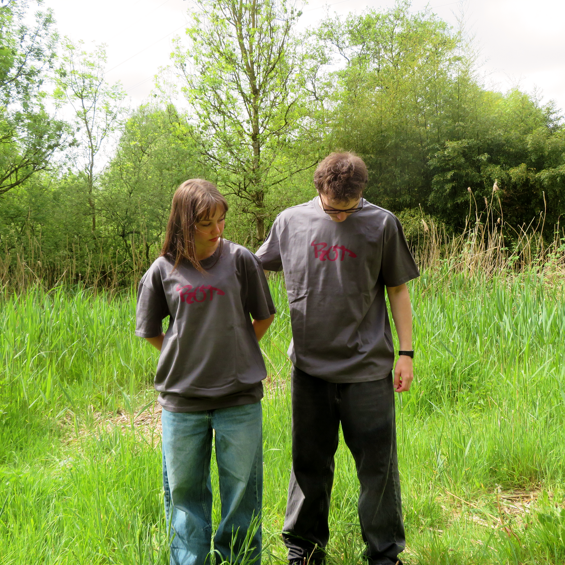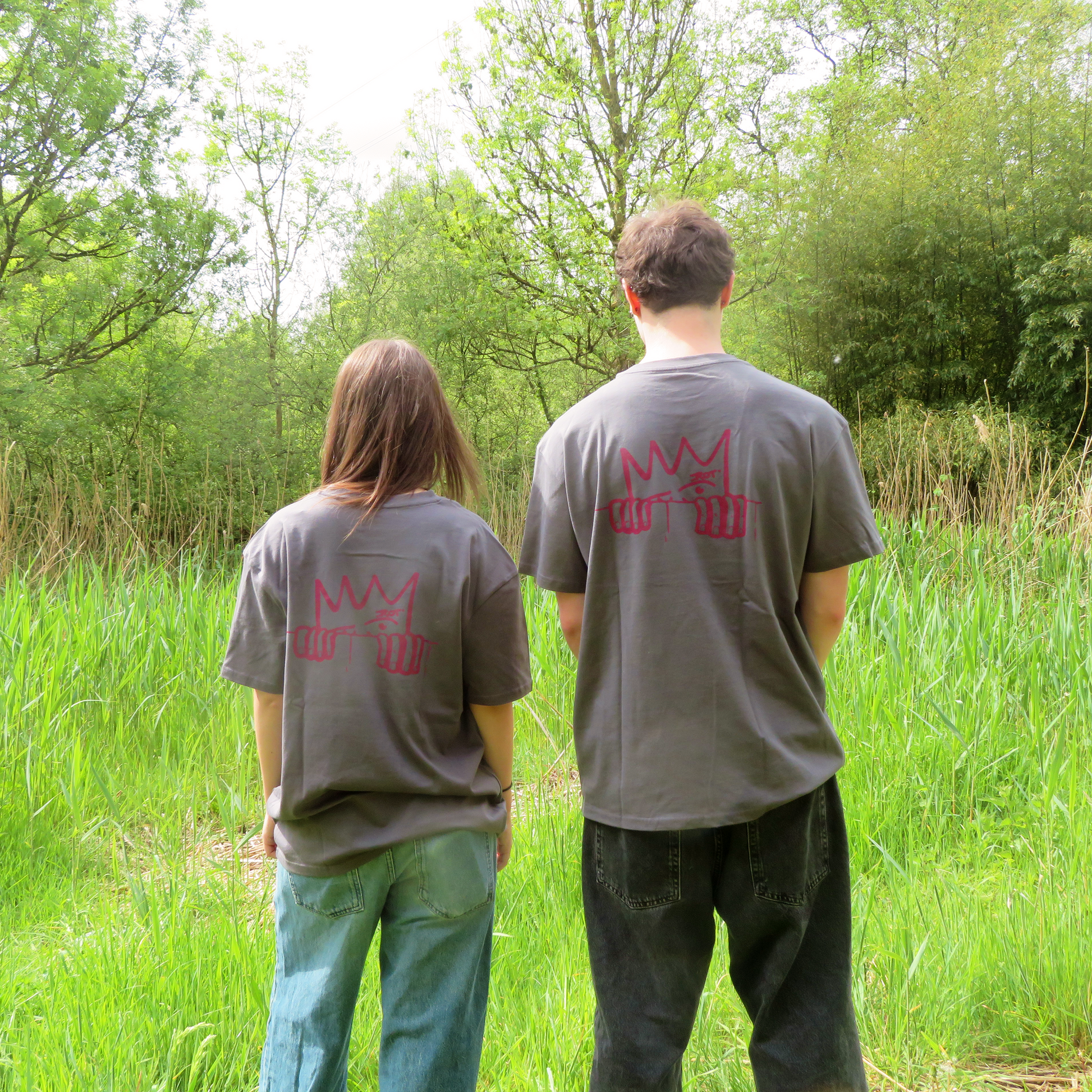An OVERSIZED dark grey graphic tee with screenprint on front and back.
